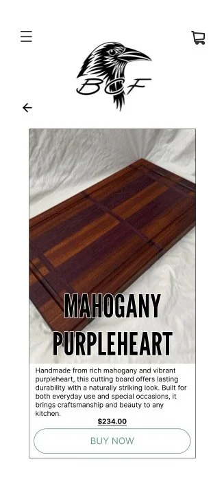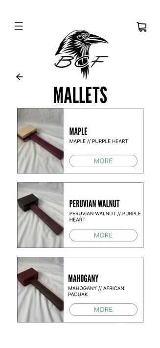 The final design delivers a clear, mobile-first ecommerce experience that highlights BCF’s craftsmanship while supporting both direct product purchases and custom inquiries. Users can quickly browse mallets and cutting boards, understand material differences, and move through checkout or custom requests without unnecessary friction. The experience scales naturally to desktop, maintaining the same structure and hierarchy across devices.